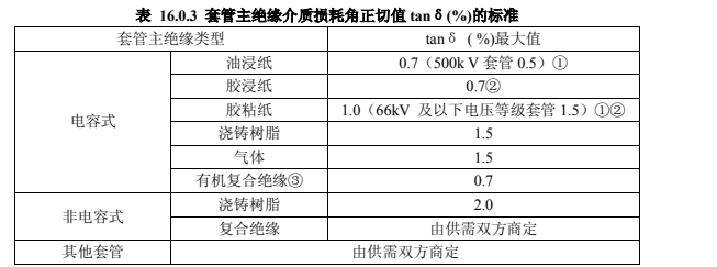 2.應(yīng)在分閘狀態(tài)下測量每只套管的 tanδ 。當(dāng)測得值超過標(biāo)準(zhǔn)時,應(yīng)卸下油箱后進(jìn)行分解試驗,此時測得的套管的 tanδ (%)值,應(yīng)符合本標(biāo)準(zhǔn)表 16.0.3 的規(guī)定。