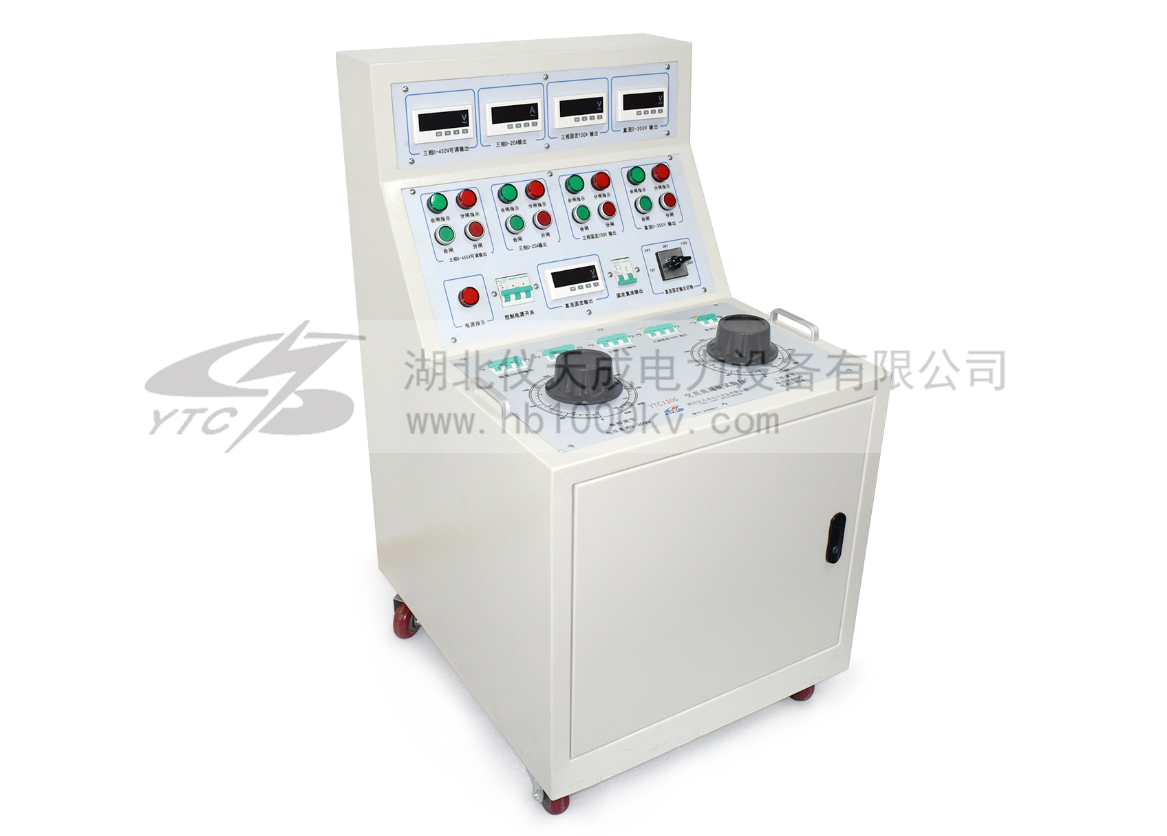 1、三相AC100V輸出(固定值) 一組 2、三相AC 0 - 50A輸出(〈10V,可調值) 一組 3、交流操作電壓輸出 AC 0 – 420V,220V時,電流小于10A 一組 4、直流操作電壓輸出24V.36Ⅴ.48Ⅴ.110Ⅴ.220Ⅴ 5、單相AC220V輸出(固定值,插座形式) 二組 6、三相AC380V輸出(固定值,接線柱) 二組 |