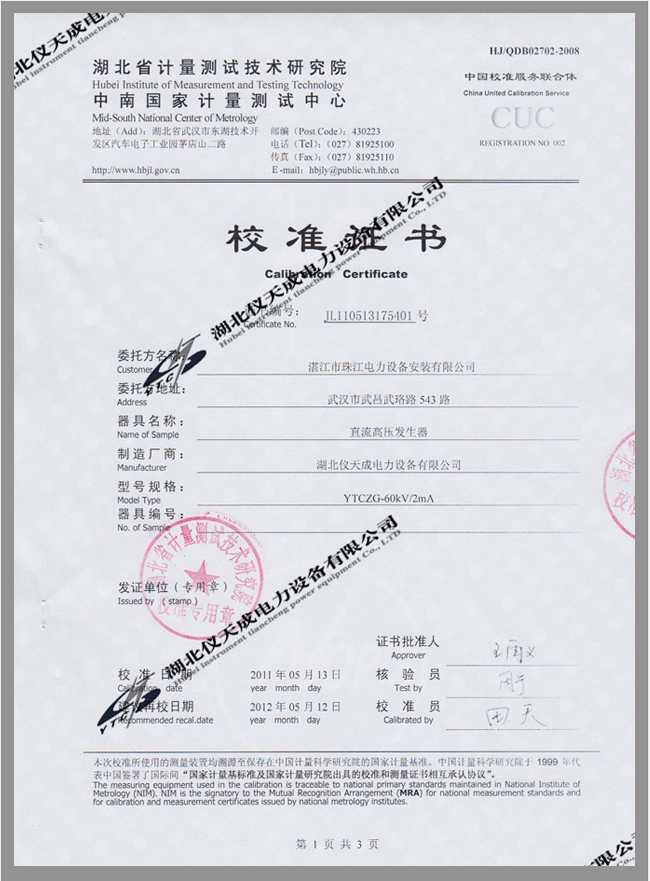 轉(zhuǎn)載:"YTCZG-60kV/2mA直流高壓發(fā)生器鑒定證書" 請(qǐng)注明來(lái)源于儀天成電力。 更多技術(shù)問題請(qǐng)致電儀天成電力客戶服務(wù):027-87876585,技術(shù)部專線:027-87876585,在線客服: